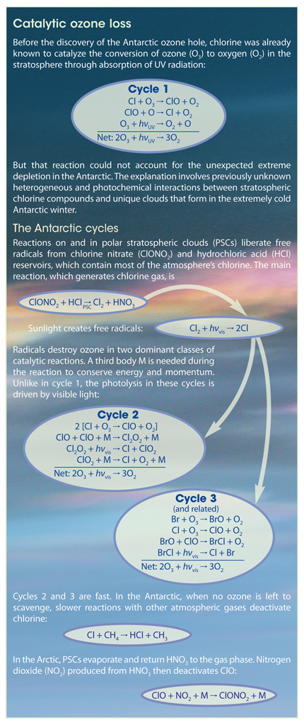 Heterogeneous chemical reactions on and within particles in the PSCs convert the HCl and ClONO2 reservoir gases into Cl2, a weakly bound molecule that is easily photolyzed into Cl free radicals.6,7 Moreover, PSCs impede chlorine deactivation into the reservoir ClONO2 (see the box). Gas-phase nitric acid (HNO3) condenses to form PSC particles and reduces available reactive nitrogen.8 Large particles fall out of the stratosphere altogether, a process known as denitrification, so HNO3 is not returned to the gas phase when PSCs evaporate. Still, high concentrations of Cl radicals did not explain the ozone hole; the Cl–ClO catalytic reaction requires atomic oxygen, produced when ozone is photolyzed by UV light, which is nearly absent from the lower-stratospheric vortex at the very low Sun angles of the Antarctic winter.